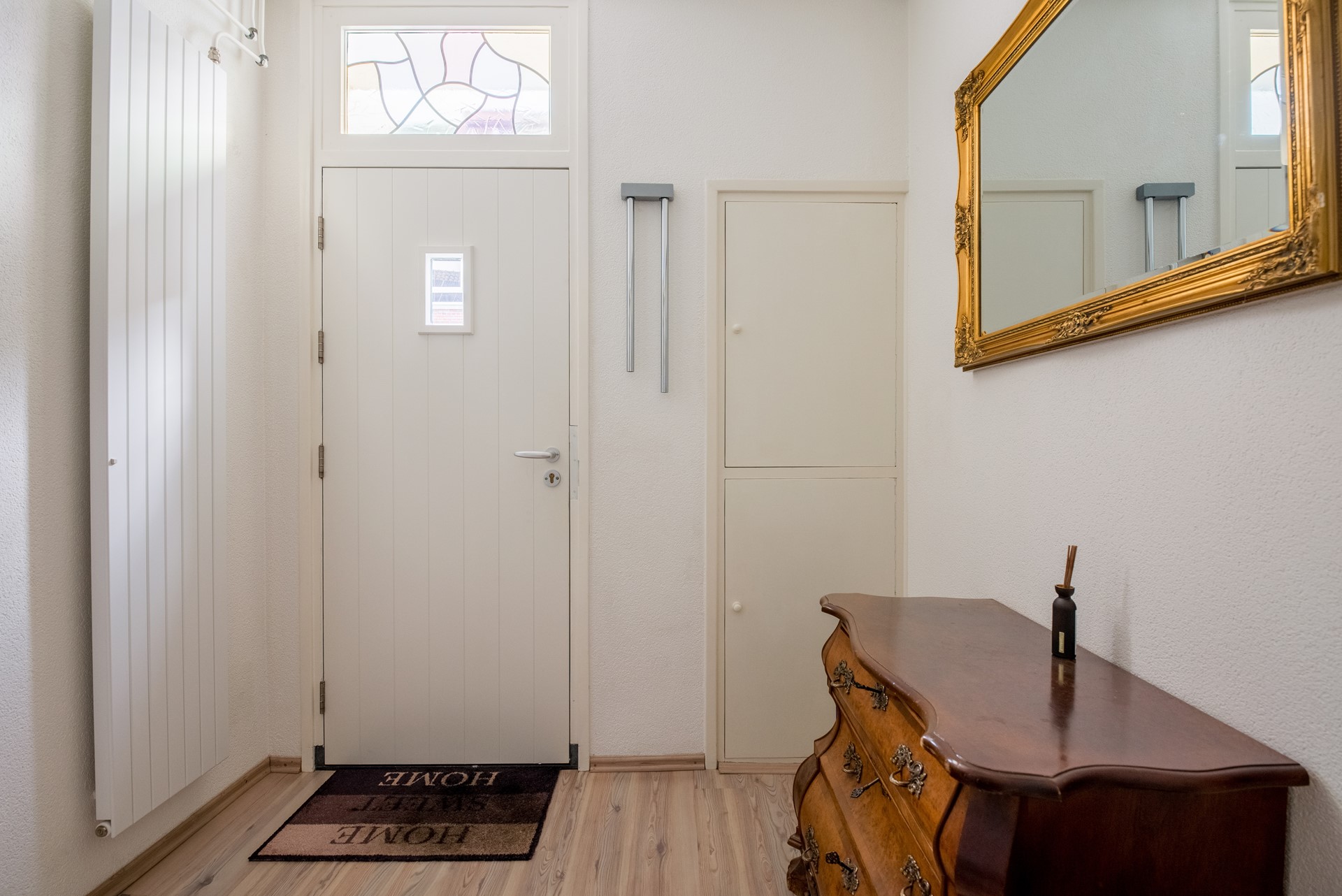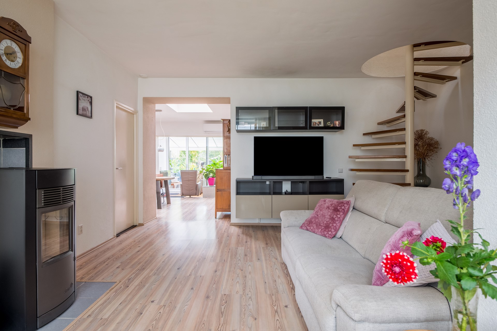 Via een kleine afstap vanaf de straat betreed je de hal met openslaande glazen deuren die direct zicht bieden op de woonkamer (ca. 57,5 m²). Deze vormt het hart van het huis – een sfeervolle ruimte met veel lichtinval en een warm gevoel. Hier vind je ook de pelletkachel (ter overname), airco en toegang tot de overige vertrekken.