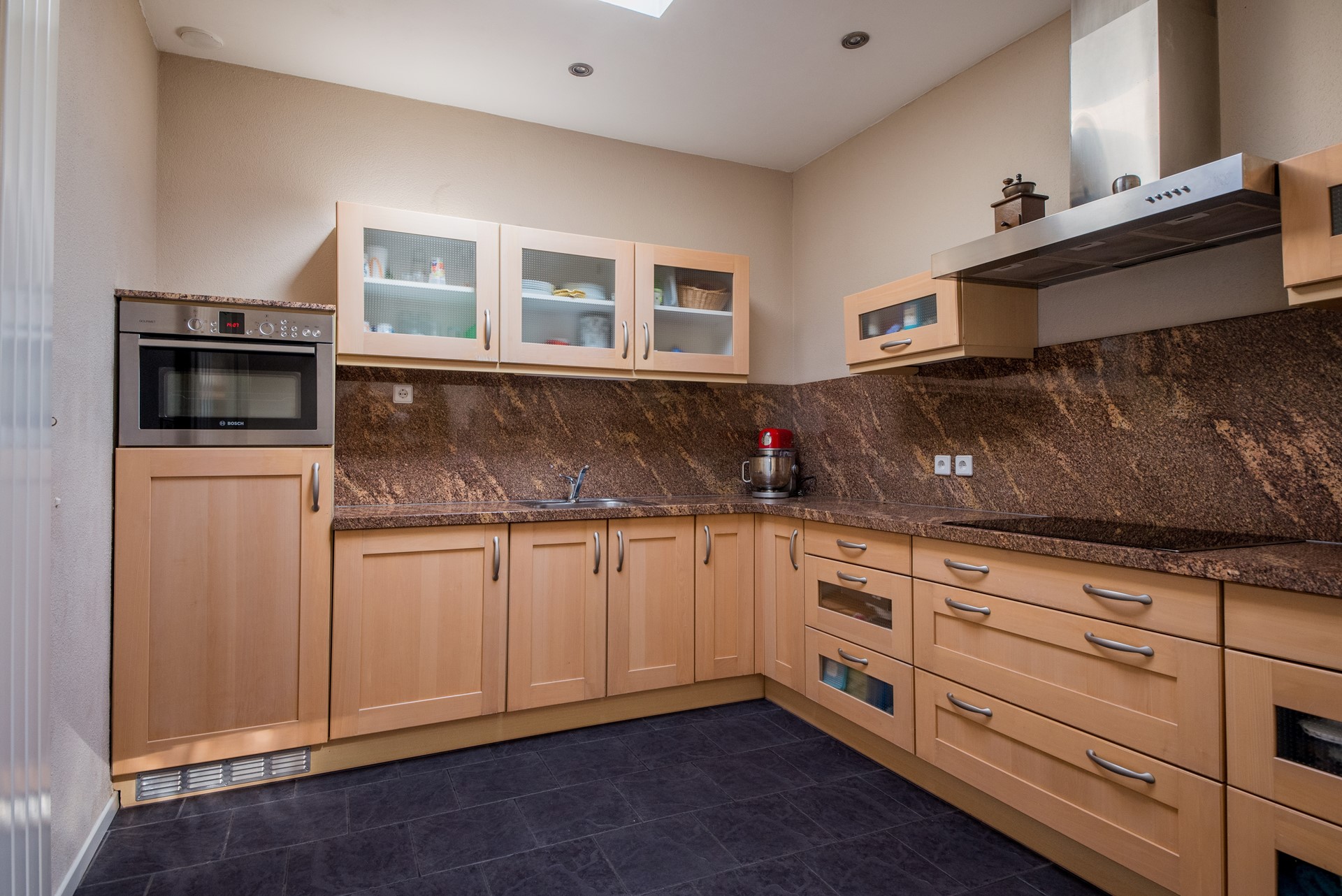 Op de begane grond bevinden zich twee slaapkamers (resp. ca. 12 m² en ca. 17 m²), een functionele keuken (ca. 11 m²), de badkamer (ca. 9 m²) en een serre (ca. 15 m²). De keuken is voorzien van moderne inbouwapparatuur zoals een inductiekookplaat, combi-oven, vaatwasser en afzuigkap. Aan de achterzijde ligt de praktische bergruimte met witgoedaansluiting, gevolgd door de ruime badkamer met toilet, dubbele wastafel, ligbad en douche.