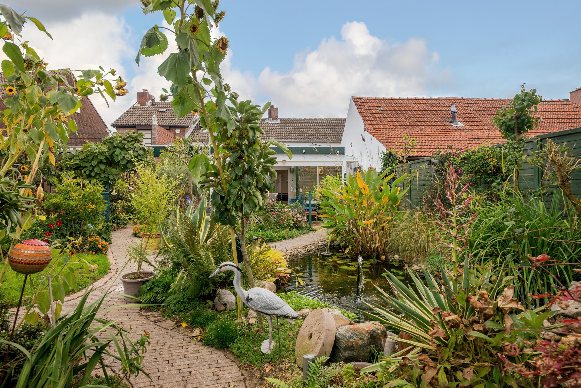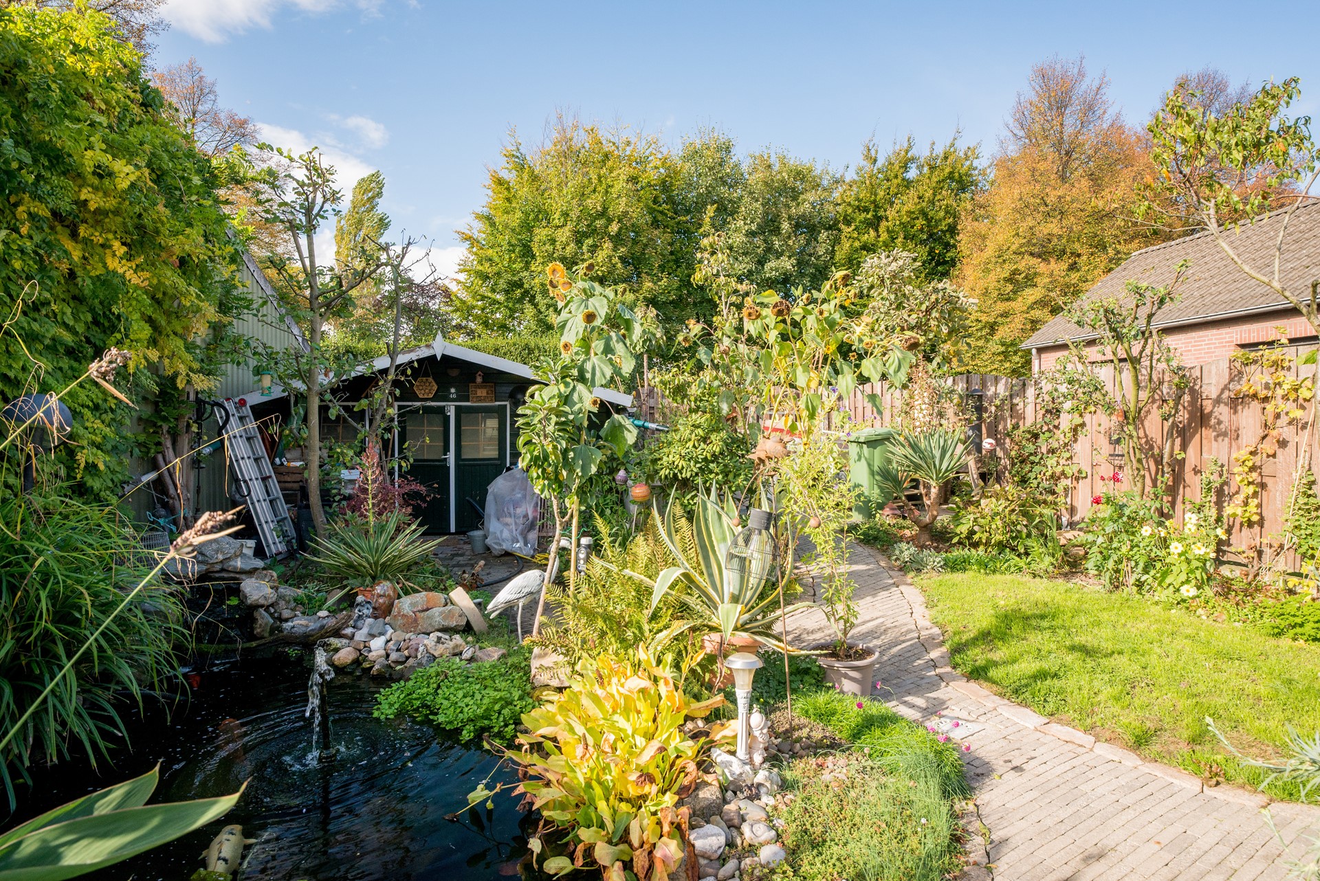 De achtertuin is een groene oase van rust, zorgvuldig aangelegd en rijk aan beplanting. Vanuit de serre loop je via een glazen schuifwand de tuin in, waar een diversiteit aan planten, een waterpartij en een fijn terras op je wachten. De tuin is ca. 17 meter diep en 8,5 meter breed, georiënteerd op het noordwesten en voorzien van een achterom. Achterin staat een berging (ca. 2,7 x 4,2 m), ideaal voor fietsen en tuingereedschap.